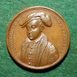 Edward VI (1537-1553), King of England and Ireland (1547-1553), was the only legitimate son of Henry VIII. His mother Jane Seymour, Henry’s third wife, died 12 days after his birth. Henry had decreed that during Edward’s minority the government was to be run by a council of regency. In fact, he reigned under two regencies: Edward’s uncle, Edward Seymour, Duke of Somerset (1547-1549), who wielded almost supreme power as regent, and the Duke of Northumberland (1549-1553). A devout Protestant, Edward endorsed Archbishop Thomas Cramer’s revision of the Book of Common Prayer. Clever but frail, Edward died of tuberculosis at the age of sixteen years after willing the crown to Northumberland’s daughter-in–law, Lady Jane Gray, to exclude his catholic sister, Mary I (who, in fact, did succeed him). He did not marry and had no issue. (Taken, in part, from Thompson) |
