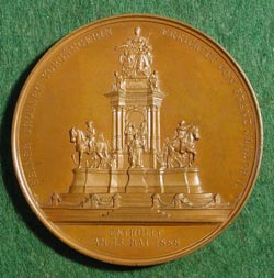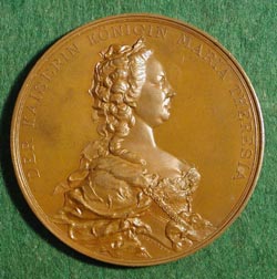 UNVEILING OF THE MARIA THERESA MONUMENT AT VIENNA SCHARFF, Anton: Austria, 1888, Bronze, 63 mm Maria Theresa (1717-1780) was Archduchess of Austria and ruler of the Austrian Habsburg dominions from 1740 to 1780. She succeeded her father, Emperor Charles VI, by the Pragmatic Sanction, but was challenged by neighboring powers in the War of the Austrian Succession (1741-1748), losing Silesia to Prussia but securing the imperial title for her husband, Francis I. Her rule was generally benign and moderately reformist. After the death of Francis (1765) she ruled jointly with her son, Emperor Joseph II. (From Encyclopedia of World History.) LINK to engraving and biography of Maria Theresa (from Wikipedia) |
