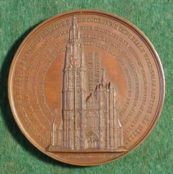 NOTRE DAME AT ANTWERP WIENER, Jacques and Leopold: Belgium, 1845, Bronze, 50 mm The Cathedral of Notre Dame in Antwerp, Belgium, is the most striking building in the city. It was begun in the 14th century and not completed until nearly 200 years later. It is the biggest church in the city, having a tower more than 400 feet high, and one of the finest Gothic buildings in the country. The cathedral contains, among other paintings, three of Rubins' masterpieces : "The Descent from the Cross," "The Elevation of the Cross," and " The Assumption". LINK to Descent from the Cross by Peter Paul Rubens (from Web Gallery of Art) |
