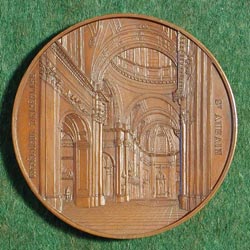 ST. AUBAIN AT NAMUR WIENER, Jacques and Leopold: Belgium, 1846, Bronze, 50 mm In 1047, Albert II, Count of Namur, caused the erection of a collegiate church on the site of an ancient chapel . The first dean, Frederick of Lorraine secured from the chapter of Mainz a portion of the head of the martyr St. Aubain. Accordingly, the collegiate church took the name of St. Aubain the Martyr. In 1429 Count John III sold the countship to Philip the Good, Duke of Burgundy. Thenceforth, until the French Revolution, Namur belonged to the House of Burgundy-Austria, except during the years 1692-95, when it was occupied by Louis XIV. Charles the Bold, Philip the Fair, Charles V, Albert and Isabella all took the oath in the sanctuary of St. Aubain. This church thus held a most important place in the political life of the country. It was rebuilt as the cathedral Saint Aubain at Namur in the eighteenth century after the model of St. Peter's at Rome. Don John of Austria is buried there. (from newadvent.org) |