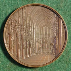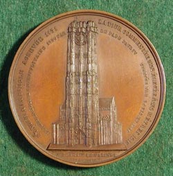 ST. ROMBAUT AT MALINES WIENER, Jacques and Leopold: Belgium, 1846, Bronze, 50 mm Malines (Flemish, Mechlin) is an ancient and important city in Belgium and since 1559, the seat of the only Belgian archbishopric. Its cathedral, which was dedicated to St. Rombaut , was begun in the 12th century, was finished early in the 14th century, and was modified in the 15th after a fire. The massive tower of over 300 feet, which is described as unfinished because the original intention was to carry it to 500 feet, is its most striking external feature. The cathedral contains a fine altarpiece by Van Dyck. |