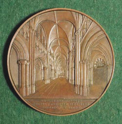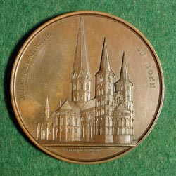 BONN CATHEDRAL WIENER, Jacques: Germany, 1855, Bronze, 59 mm The Munster (cathedral) of Bonn is situated in the central part of the city. It is built of gray stone in Romanesque and Transitional styles (12th and 13th centuries). It is surmounted by five towers, of which the central is a landmark in the Rhine valley. Bonn was the capital of the German Federal Republic and Beethoven's birthplace. Its finest building is the famous old university founded in 1786 by the archbishop elector Maximilian. LINK to History of Ecclesiastic Architecture (from World History at KMLA) |