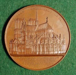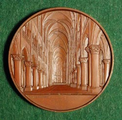 NOTRE DAME CATHEDRAL IN PARIS WIENER, Jacques and Charles: France, 1855, Bronze, 59 mm The early Gothic cathedral of Notre Dame is situated on the Ile de la Cite in Paris. It is a fine example of Gothic architecture, noted for its flying buttresses, which were a technical advance providing support, and for the rose window in the west facade. One of the most daring constructions of its time, it has a wide nave and double ambulatory. The west facade was imitated in many French churches. LINK to photo of Notre Dame Cathedral (from GreatBuildings.com) |