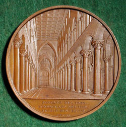 DUOMO DI PISA WIENER, Jacques: Italy, 1855, Bronze, 59 mm Pisa is an archiepiscopal see of Tuscany, Italy. The cathedral, the baptistery, and famous leaning tower form a group by themselves . The cathedral and baptistry are built in black and white marble, a characteristic found in Pisan churches elsewhere. The architects of the cathedral were Buschetto and Rinaldo. The church is in the plan of a Latin cross. The nave has double vaulted aisles and the transepts a single aisle. At the intersection of the nave and transepts is a dome. The columns of the nave and side aisles are ancient. The west front is the finest part of the exterior: the range of arches running around the base is repeated by four open arcades. The three bronze doors were re-made after the fire of 1596; that of the south side is by Bonanno. The mosaics in the apse were designed by Cimabue, and the splendid decagonal pulpit is by Giovanni Pisano. LINK to photo of Cathedral at Pisa (from GreatBuildings.com) |