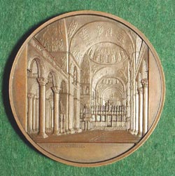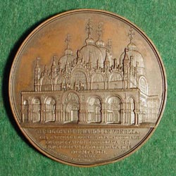 BASILICA SAN MARCO IN VENEZIA WIENER, Jacques: Italy, 1850, Bronze, 59 mm St. Mark's Basilica in Venice, Italy, was begun about 826 as a small wooden church to enshrine the remains of the city's patron saint, St. Mark, brought from Alexandria. It was restored after a fire in 976. It was later demolished and rebuilt in the 11th century in the Byzantine style. Originally the private chapel of the doge, it is unique in respect to its richness of material and decoration. It was graced with the spoils of countless other regions as there was a law of the republic requiring every merchant trading to the east to bring back some material for its adornment. In plan, St. Mark's is a Greek cross of equal arms, covered by a dome in the center and by a dome over each of the arms. The plan is derived from the Church of the Holy Apostles at Istanbul, now covered by the mosque of Mohammed II. The exterior facade is enriched with marble columns. The top forms a wide gallery, in the center of which stand the four colossal bronze horses which belonged to a Greco-Roman triumphal quadriga. LINK to painting The Square of Saint Mark's, Venice by Canaletto (from National Gallery of Art) |