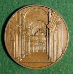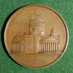 ST ISAACS CHURCH IN ST PETERSBURG WIENER, Jacques: Russia, 1858, Bronze, 59 mm St. Petersburg, which for political reasons has also been called over the years Petrograd and Leningrad, is, after Moscow, the largest city and most important cultural center in Russia. Architecturally St. Petersburg is one of the most beautiful cities in the world, combining stately architecture with planned squares, wide avenues and many parks and gardens. One of its most grandiose buildings is St. Isaacs cathedral, erected according to the design of Auguste Monferrand. |