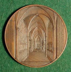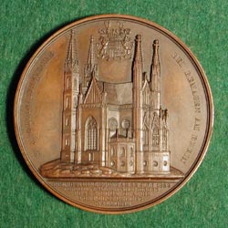 ST APOLLINARIS CHURCH AT REMAGEN-ON-RHINE WIENER, Jacques: Germany, 1856, Bronze, 59 mm St. Apollinaris church is situated just below the town of Remagen in the Prussian Rhine Province. It stands on a height overlooking the Rhine on the site of a chapel formerly dedicated to St. Martin. E.F. ZWIRNER, mentioned on the reverse of the medal, is Ernst Friedrich Zwirner (1802-1861), who was responsible for the construction of the cathedral. Zwirner also built the Synagogue at Cologne and was the architect for the reconstruction of Cologne Cathedral. His works won him every conceivable honor and distinction. It is said that his devotion to the work of restoring the Cologne cathedral was so great that many of his contemporaries felt his zeal had hastened his death (Eidlitz). |