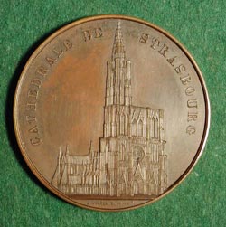 CATHEDRAL AT STRASBOURG WIENER, Jacques: France, 1861, Bronze, 59 mm Strasbourg is a town in France two miles west of the Rhine. The old city contains the cathedral, or Munster built between the 11th to 15th centuries. Part of the crypt dates from 1015. The apse is Transitional in style whereas the nave, finished in 1275, is pure Gothic. The elaborate west facade has a screen of double tracery, numerous sculptures and two towers, the northern one having a tall spire. The cathedral has some fine stained glass, a sculptured pulpit and a famous astronomical cloak, containing some fragments of the original clock built in 1574 by the mathematician, Conrad Dasypodius. |