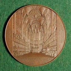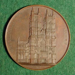 WESTMINSTER ABBEY WIENER, Jacques: England , 1856, Bronze, 59 mm Westminster Abbey is a Gothic church in London. It is cruciform in plan. It was originally the abbey church of a Benedictine monastery which was closed in 1539. In 1050, Edward the Confessor began to build a Norman church on the site, and in 1245, Henry III began work on the present structure. The Lady Chapel, dedicated to Henry VII, is a fine example of the perpendicular style. The two western towers were built between 1722 and 1745 by Sir Christopher Wren and Nicholas Hawksmoor, and the 19th century restoration was managed by Sir George Gilbert Scott. Since William the Conqueror, most English monarchs have been crowned in the abbey. It is also the burial place of 18 monarchs. A Poet' Corner lies in the south transept. |