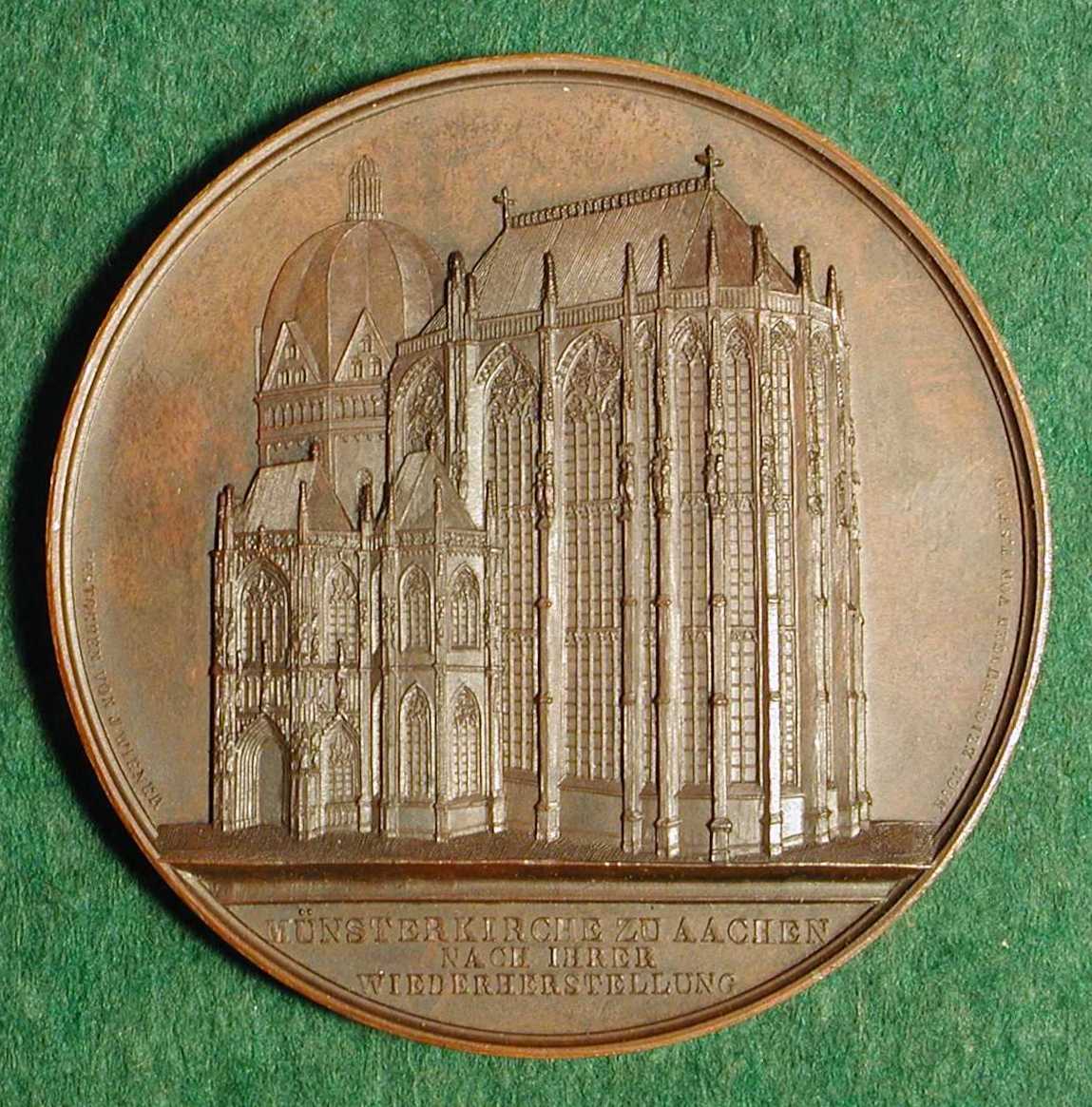 CATHEDRAL AT AACHEN (AIX-LA-CHAPELLE) WIENER, Jacques: Germany, 1849, Bronze, 59 mm As the legend of the exergue indicates, the Cathedral at Aachen was begun under Charlemagne's auspices in 796. It was almost entirely wrecked by Norman raiders and rebuilt by the Emperor Otto in 983. The octagonal domed structure dates from that period. The Gothic choir was added in the 14th and early 15th centuries. The Barbarossa Chandelier was made on the order of Emperor Frederick I (nicknamed Barbarossa) in the 12th century. The spire is modern and was damaged during World War II, as were the roofs of the chapel and baptistery. Aachen is not a cathedral in the customary use of the word as Aachen was not a seat of a bishop.