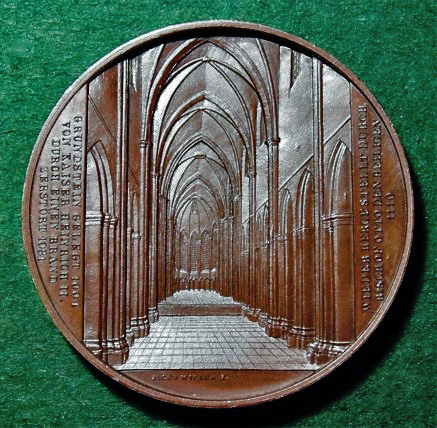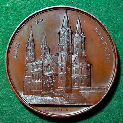 CATHEDRAL AT BAMBERG WIENER, Jacques: Germany, 1861, Bronze, 59 mm Bamberg is a town and archiepiscopal see of Germany, in the Land of Bavaria. The cathedral, a late Romanesque building, was founded in 1004 by the emperor Henry II. It features four imposing towers. The cathedral was later partially burned, and rebuilt in the 13th century. It contains the magnificent marble tomb of Henry II and his wife, the empress Cunigunde, the work of Riemenschneider. This one of the very few medals that was signed Jacob Wiener rather than J. Wiener Image of Veit Stoss Altar in Bamberg Cathedral LINK to History of Ecclesiastic Architecture (from World History at KMLA)