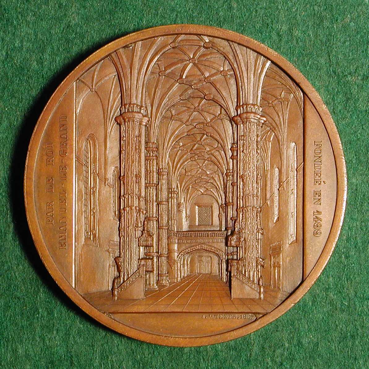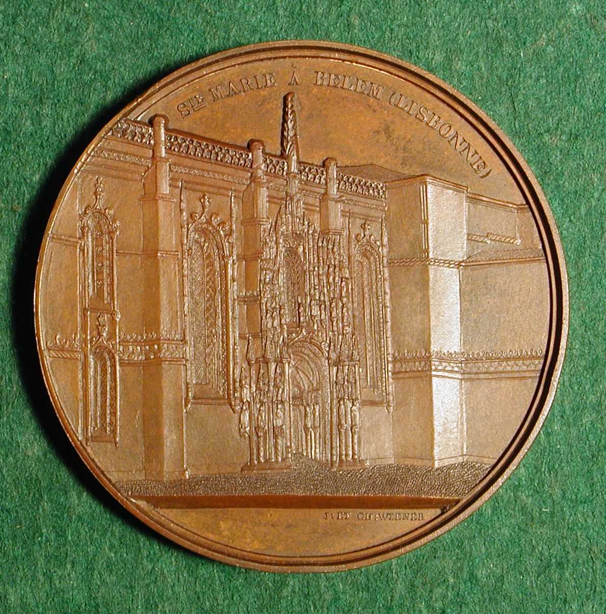 ST. MARY'S AT BELÉM, LISBON WIENER, Jacques and Charles: Portugal, 1867, Bronze, 59 mm Lisbon (Lisboa) is the capital and chief port of Portugal, standing at the westernmost point of Europe. The city is one of the most spectacular in Europe, rivaling Naples and Istanbul in its wide views, the distinctive silhouette of its buildings and its enclosed situation. In 1390 Lisbon was made an archbishopric, and in the following centuries its importance grew with the opening of the sea route to India, the discovery of Brazil and widespread voyages of Portuguese mariners. It became a great commercial port and the center of the distribution of the riches of the Spanish overseas empire from 1580 to 1640. It was from Lisbon that the Spanish Armada sailed in 1588. Much of the city was devastated in 1755 in the Great Lisbon Earthquake. St. Mary's at Belém (Santa Maria de Belém) was founded in 1499 by Emanuel I (Monoel) (1469-1521), 14th king of Portugal. His reign is noteworthy for Vasco da Gama's opening of an all-sea route to India and Cabral's landing in Brazil. His intense religious zeal manifested itself in his persecutions of the Jews, in endeavors to promote a crusade against the Turks, and his building of numerous monasteries, churches and cathedrals. Today the building is usually known as the Jerónimos Monastery or the Hieronymus Monastery because the King gave it to the monks of the Order of St. Jerome. The ornate main entrance to the monastery was designed by João de Castilho and is considered to be one of the most magnificent of his time. Among its features are numerous gables, pinnacles and carved figures, including statues of Henry the Navigator and the Madonna of Belém. LINK to Jerónimos Monastery (from Wikipedia) LINK to Vasco da Gama (from Wikipedia) LINK to History of Ecclesiastic Architecture (from World History at KMLA) LINK to Photo of St. Mary's at Belém (by Ben Weiss)