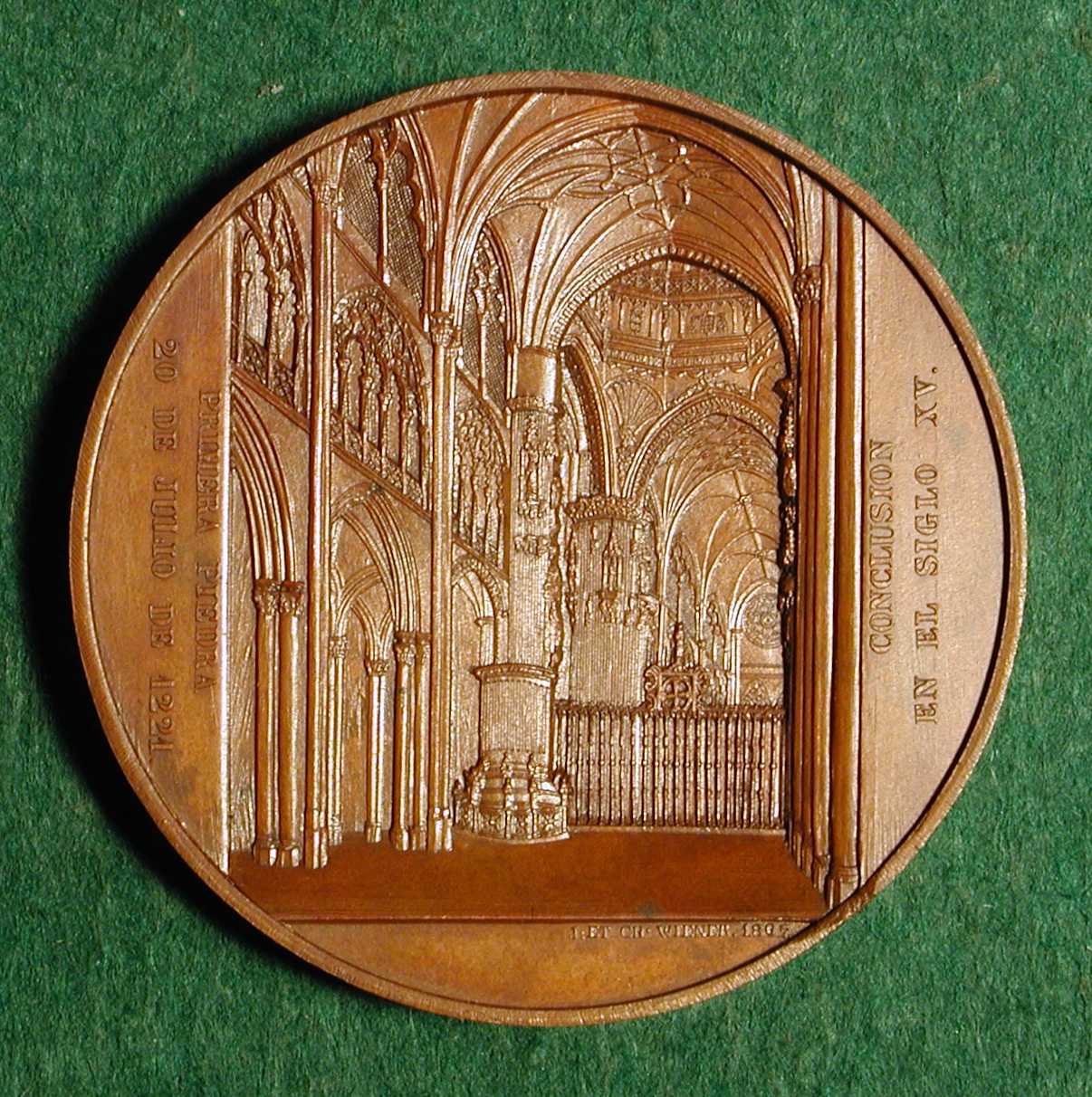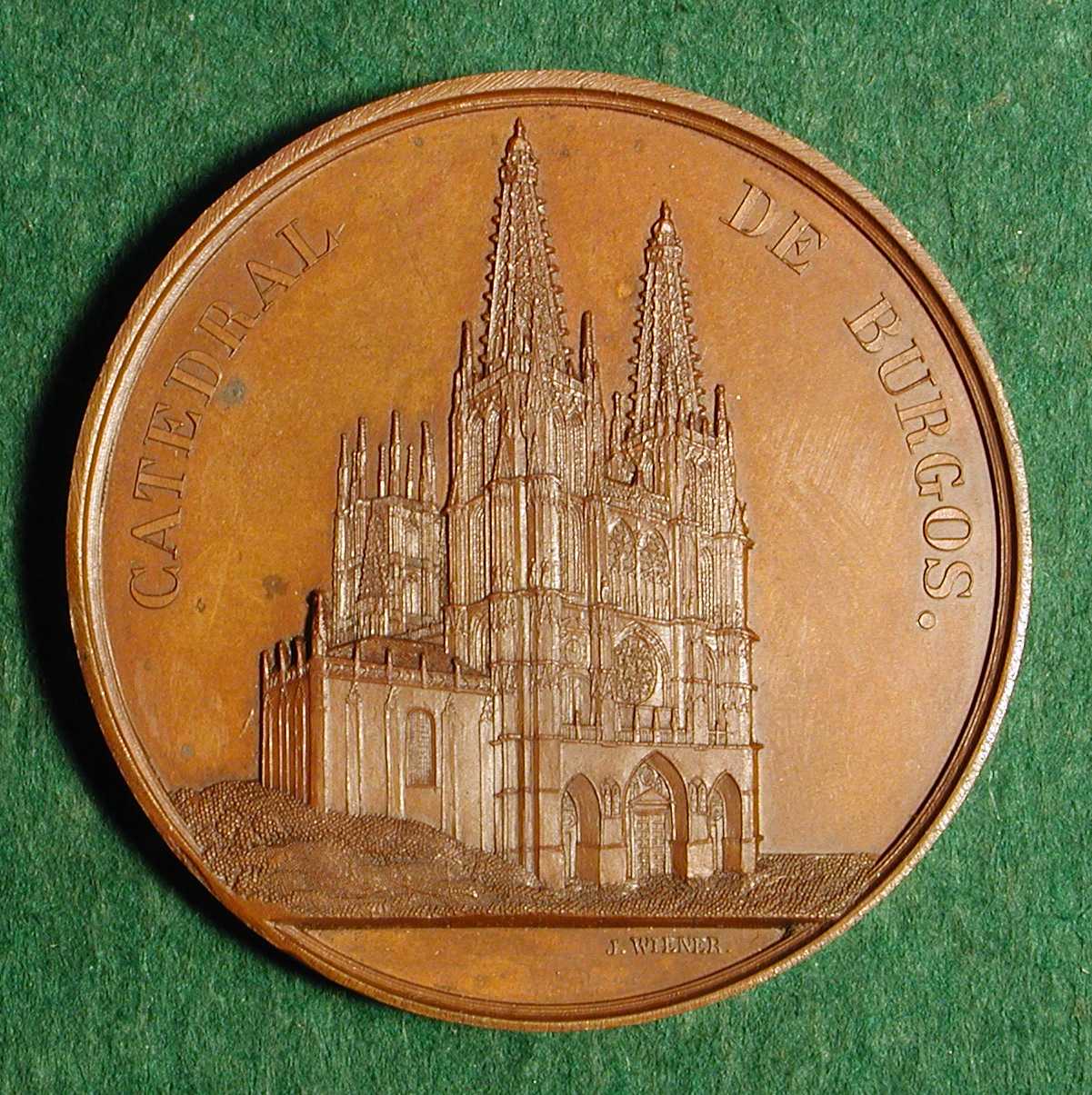 BURGOS CATHEDRAL WIENER, Jacques and Charles: Spain, 1867, Bronze, 59 mm Burgos is the former capital of Old Castile, which after 1833 became the capital of the Spanish province of Burgos. The oldest quarter of the town, with the older churches, stands on the eastern slope of the Castle Hill. A broad, cobbled and terraced alley descends steeply to the cathedral. The Burgos Cathedral, founded in 1221 by Ferdinand III of Castile and the English bishop Maurice of Burgos, is a fine example of florid Gothic, built of white limestone. It was not completed until 1567. The architects principally responsible for its construction were a Frenchman in the 13th century and a German in the 15th. Its cruciform design is almost hidden by the 15 chapels added at all angles to the aisles and transepts, by the beautiful 14th century cloister on the northeast and by an archiepiscopal palace on the southwest. Over the three central doorways of the main facade rise two lofty and graceful towers. Many of the monuments within the cathedral are of considerable artistic and historical interest. The chapel of Corpus Christi contains the chest which, according to legend, the Cid is said to have filled with sand and subsequently fraudulently sold for a large sum to some of the citizens of Burgos Engraving of cathedral facade by Genaro Villaamil and Charles Bachelier (1850) LINK to History of Ecclesiastic Architecture (from World History at KMLA)