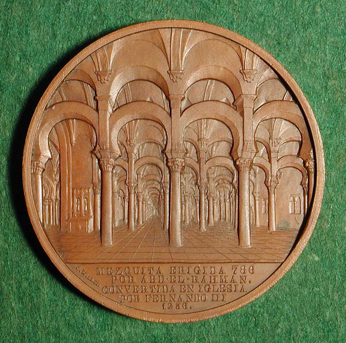CATHEDRAL AT CÓRDOBA WIENER, Jacques: Spain, 1859, Bronze, 59 mm Cordova is the capital of the Spanish province of the same name. It is a typically Moorish city, with narrow, winding streets, especially in the older quarter. The most glorious building of Cordova, surpassing its other Moorish or Christian buildings, is the Mezquita, or mosque. This Great Mosque of Cordova was originally founded on the site of a Roman temple and a Visigothic church by Abd-ar-Rahman I in 786, who wished to confirm the power of his caliphate by making its capital a great religious center, rivaling those of the East. Over the years a number of additions were made to the mosque until its original size was more than doubled, making it the second largest sacred building of Islam, after the Kaaba at Mecca. The ground plan is in the form of a rectangle and is only slightly smaller than St. Peter's in Rome. The mosque has a carved and painted wooden ceiling. The most exquisite work in the whole mosque, however, is found in the third Mihrab, or prayer niche, a small octagonal recess roofed with a single block of white marble, carved in the form of a shell and with its walls inlaid with Byzantine mosaics. As the exergue on the medal indicates, in 1236 Cordova was captured by Ferdinand III of Castile, who converted the mosque into a cathedral, as it now contains a Catholic Main Altar and Capilla Sagrario. Its minaret was changed into a bell tower and an entire Gothic chapel inserted into the heart of the former mosque. Photo of the Colonnes de la Mezquita (from wikipedia) LINK to History of Ecclesiastic Architecture (from World History at KMLA)