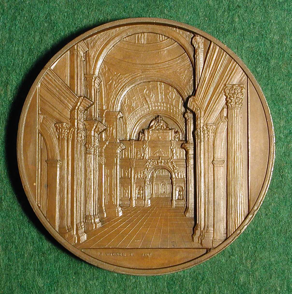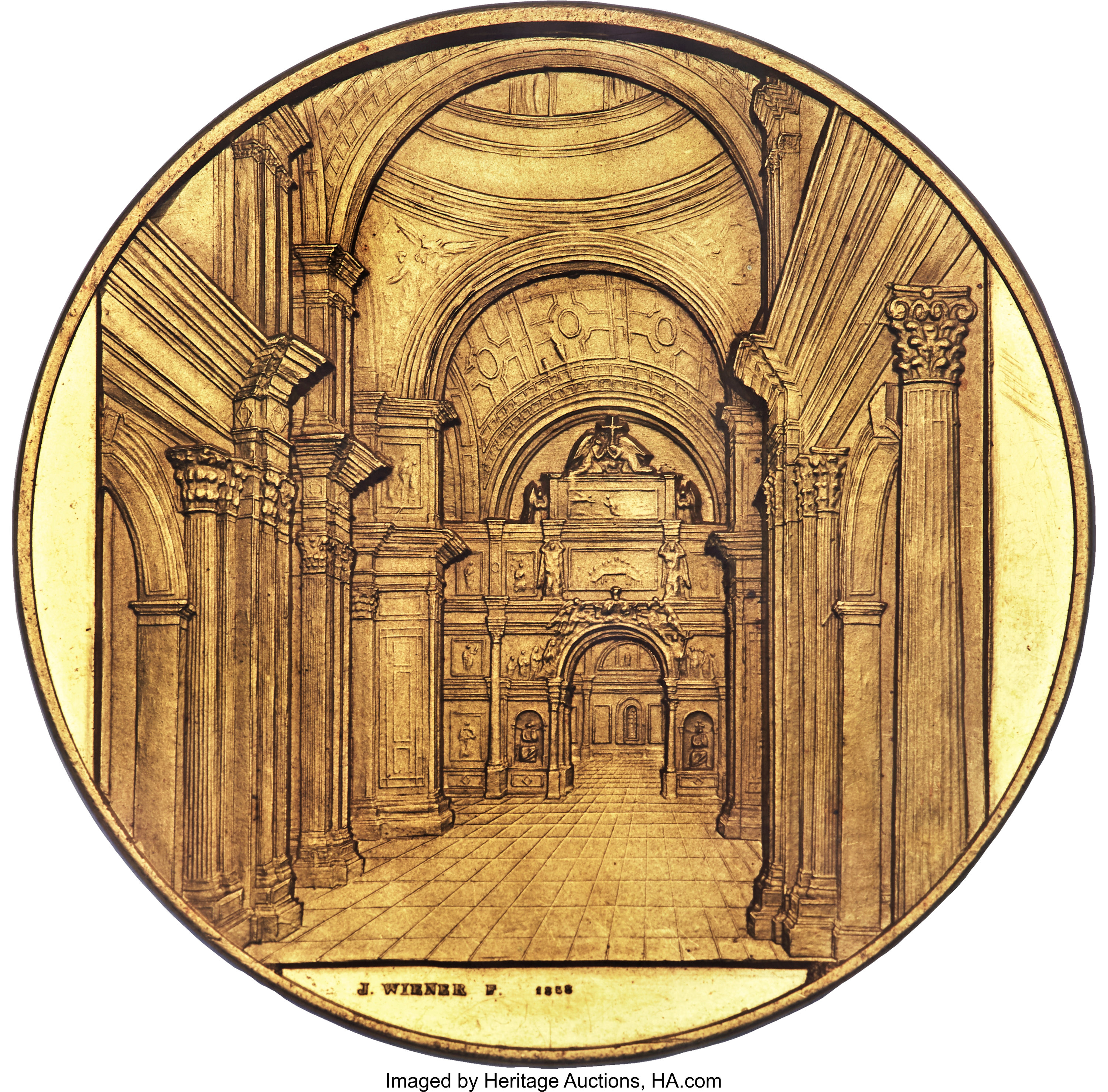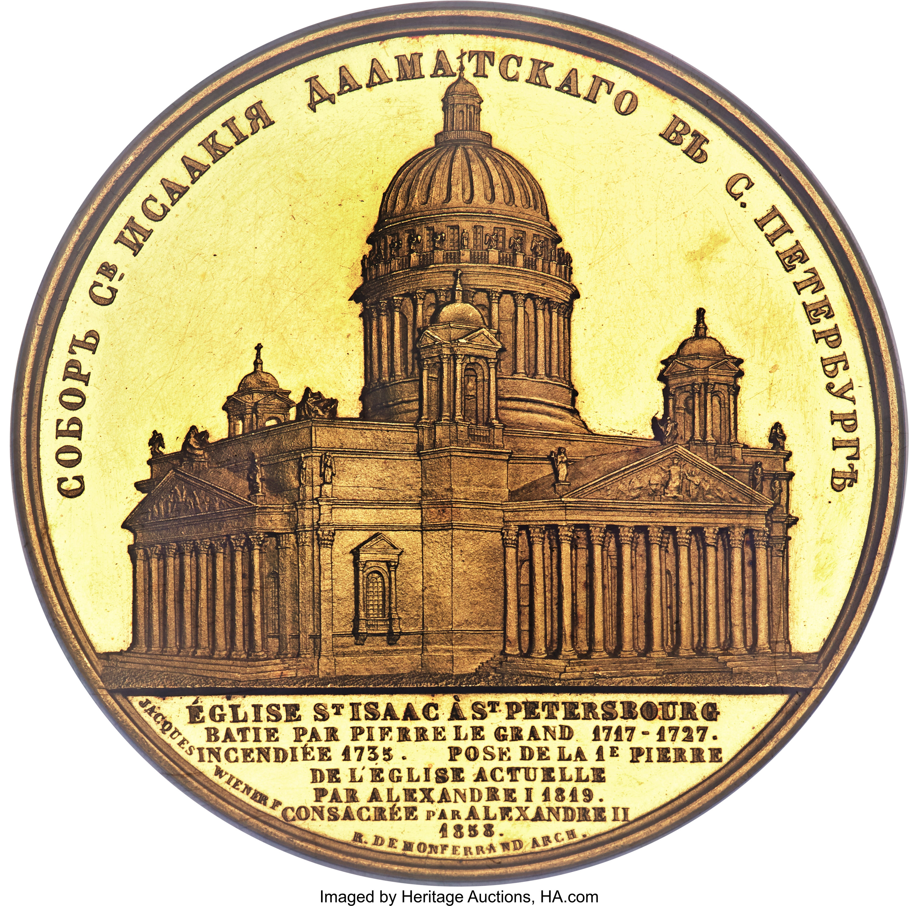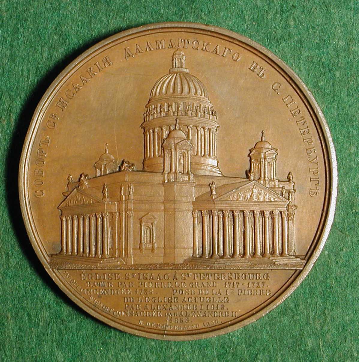 ST ISAACS CHURCH IN ST PETERSBURG WIENER, Jacques: Russia, 1858, Bronze, 59 mm St. Petersburg, which for political reasons has also been called over the years Petrograd and Leningrad, is, after Moscow, the largest city and most important cultural center in Russia. Architecturally St. Petersburg is one of the most beautiful cities in the world, combining stately architecture with planned squares, wide avenues and many parks and gardens. One of its most grandiose buildings is St. Isaacs cathedral. As the legend on the exergue indicates, it was consecrated by Alexander II in 1858, according to the design of Auguste Monferrand. LINK to Obverse and Reverse of this medal in gold (Heritage Auctions)
