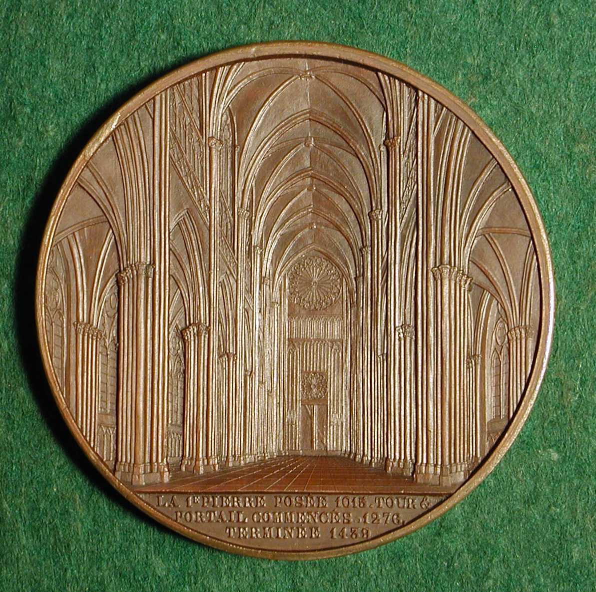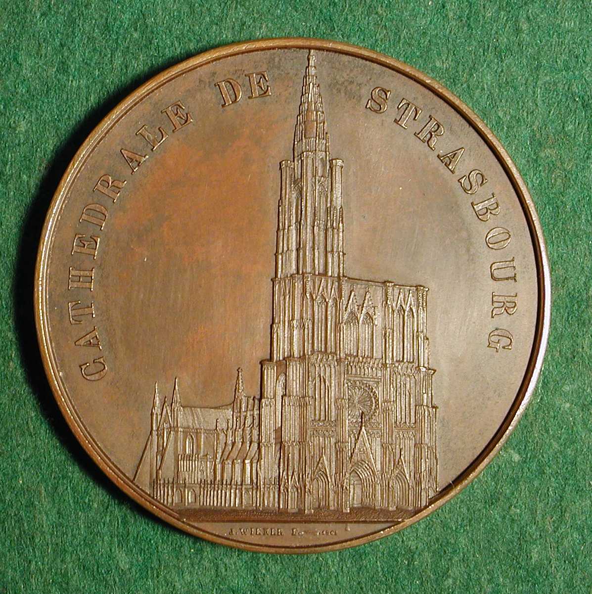 CATHEDRAL AT STRASBOURG WIENER, Jacques: France, 1861, Bronze, 59 mm Strasbourg is a town in France two miles west of the Rhine. The old city contains the cathedral, or Munster built between the 11th to 15th centuries. Part of the crypt dates from 1015. The apse is Transitional in style whereas the nave, finished in 1275, is pure Gothic. The elaborate west facade has a screen of double tracery, numerous sculptures and two towers, the northern one having a tall spire. The cathedral has some fine stained glass, a sculptured pulpit and a famous astronomical cloak, containing some fragments of the original clock built in 1574 by the mathematician, Conrad Dasypodius.