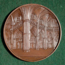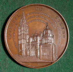 WIENER, Charles: Spain, 1850, Bronze, 59 mm The Cathedral of Toledo, founded by St. Ferdinand in 1227, is one of the three 13th century High Gothic cathedrals in Spain. It was built on the site of a Visigothic church and was modeled after the Bourges Cathedral though its five naves plan is the consequence of the constructors’ intention to cover all the sacred space of the former City Mosque with the cathedral. The spectacular incorporation of light and the structural achievements of the ambulatory vaults are some of its more remarkable aspects. One of its more outstanding parts is the Baroque altar called El Transparente, several stories high, with fantastic figures of stucco, painting, bronze castings, and multiple colors of marble, a masterpiece of Baroque mixed media. A shaft of sunlight striking it through an appropriately oriented hole in the roof gives the impression that the whole altar is rising to heaven. It is from the play of light that this feature of the cathedral derives its name. The Cathedral also receives its light through more than 750 stained glass windows, from the l4th, 15th and l6th centuries, the work of the best artists of those times. The treasury, reliquaries and library contain many priceless manuscripts and works of art, including the silver monstrance executed by Enrique de Arfe, and paintings by Goya, El Greco, Titian and Rubens. The city of Toledo is the capital of the Spanish province of Toledo and formerly of the whole country, 47 miles south-southwest of Madrid. It has an ancient history. According to an old Spanish tradition, Toledo was founded in the year 540 BCE by Jewish colonists, who named it Toledoch, that is, mother of people. Toledo later served as the capital city of Visigothic Spain and was the capital until the Moors conquered Iberia in the 8th century. Under the Caliphate of Cordoba, Toledo enjoyed a golden age. This extensive period is known as La Convivencia, i.e., the co-existence of Jews, Christians, and Muslims. This is one of the few cathedral medals that was engraved by Charles, not Jacques, Wiener. LINK to Cathedral of Toledo (from wikipedia) |