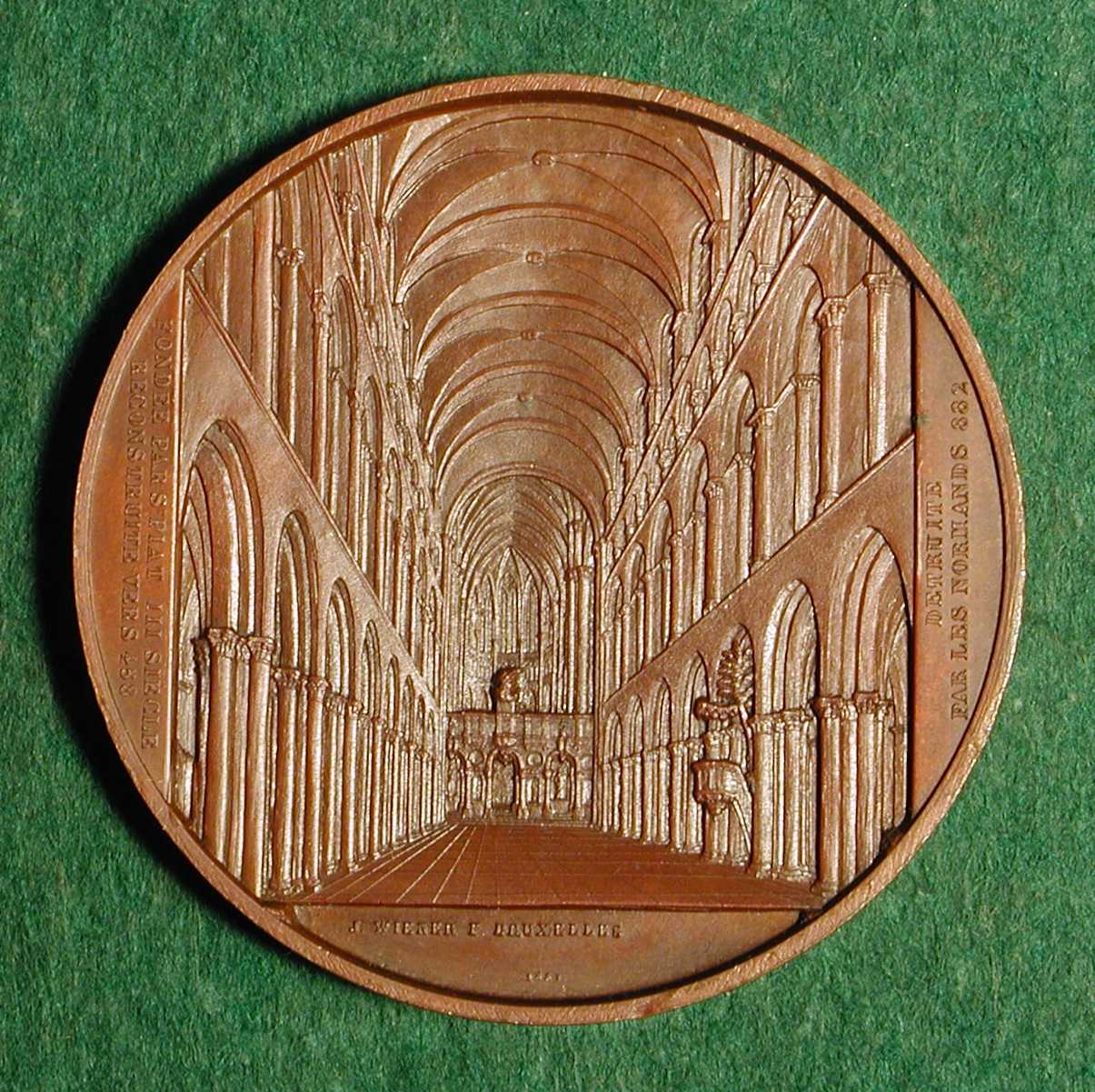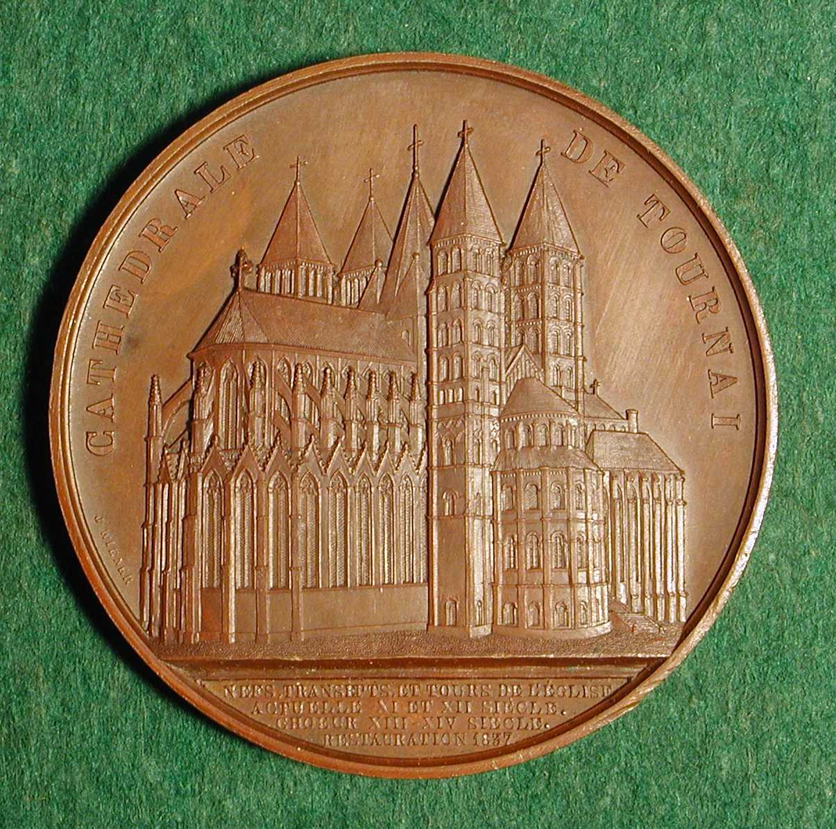 TOURNAI CATHEDRAL WIENER, Jacques: Belgium, 1857, Bronze, 59 mm Tournai (Tournay, Flemish Doornik) is a city in the province of Hainaut, Belgium, on the Scheldt. The cathedral of Notre-Dame in Tournai, Belgium, dates from 1030. The Nave is Romanesque in the style of the middle of the 12th century, and has much pointed work. The transept was added in the 13th century. The first choir was burned down in 1213, but was rebuilt in 1242 at the same time as the transept and is a superb specimen of pointed Gothic. There are five towers with spires. Painting "The Issue of Souls in Purgatory" by Peter Paul Rubens
