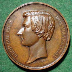 WIENER, Leopold: Belgium, 1853, Bronze, 75 mm Leopold Louis Philippe Marie Victor (1835-1909) was the eldest son of Leopold I by his second wife Louise of Orleans. He was created duke of Brabant in 1846. In 1853 the 18-year-old reached his majority and took his oath as crown prince, the event commemorated by this medal. He succeeded his father in 1865, becoming King Leopold II of Belgium. As king, Leopold was to become one of the most hated men on two continents for his colonization and exploitation of the people of the Congo Basin. The history of Leopold’s subjugation of the area is documented in Adam Hochschild’s King Leopold’s Ghost.
