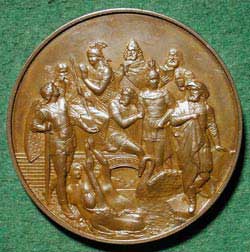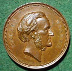 RICHARD WAGNER: BAYREUTH FESTIVAL WIENER, Charles: Germany, 1876, Bronze, 71 mm Richard Wagner (1813-1883) a German composer, music theorist, and essayist, was born in Leipzig, Germany. After marrying, he moved to Dresden where he became involved in a nationalist movement to unify the independent German States into a single nation. The resulting revolution forced Wagner to flee and move to other European countries, where he spent the next twelve years in exile. Although Wagner, in the view of many critics, was a despicable character in his personal life – being deceitful and unfaithful to his wife and friends and virulently anti-Semitic – he was brilliant as a composer. His symphonic operas (musical dramas), in which he wrote both the words and music, revolutionized the style and form of opera and are among the finest ever composed. Indeed, Wagner’s monumental Der Ring des Nibelungen, consisting of four separate operas, is considered by some as the greatest work of art of any type ever conceived. Late in his life Wagner convinced King Ludwig II of Bavaria, a great music lover, who was an admirer, friend and sponsor to Wagner, to build for him an opera house in Bayreuth, a small town in Bavaria, Germany. This Festspielhaus, which Wagner designed himself, was to perform only the works of Wagner. To this day it is considered to be among the finest operatic theaters in the world. The Bayreuth festival, the most celebrated music festival in Germany, and one which attracts politicians, celebrities and music-lovers from all over the globe, was officially inaugurated in 1876, the event likely commemorated by this medal. LINK to Biography of Richard Wagner (from Wikipedia) LINK to Bayreuth