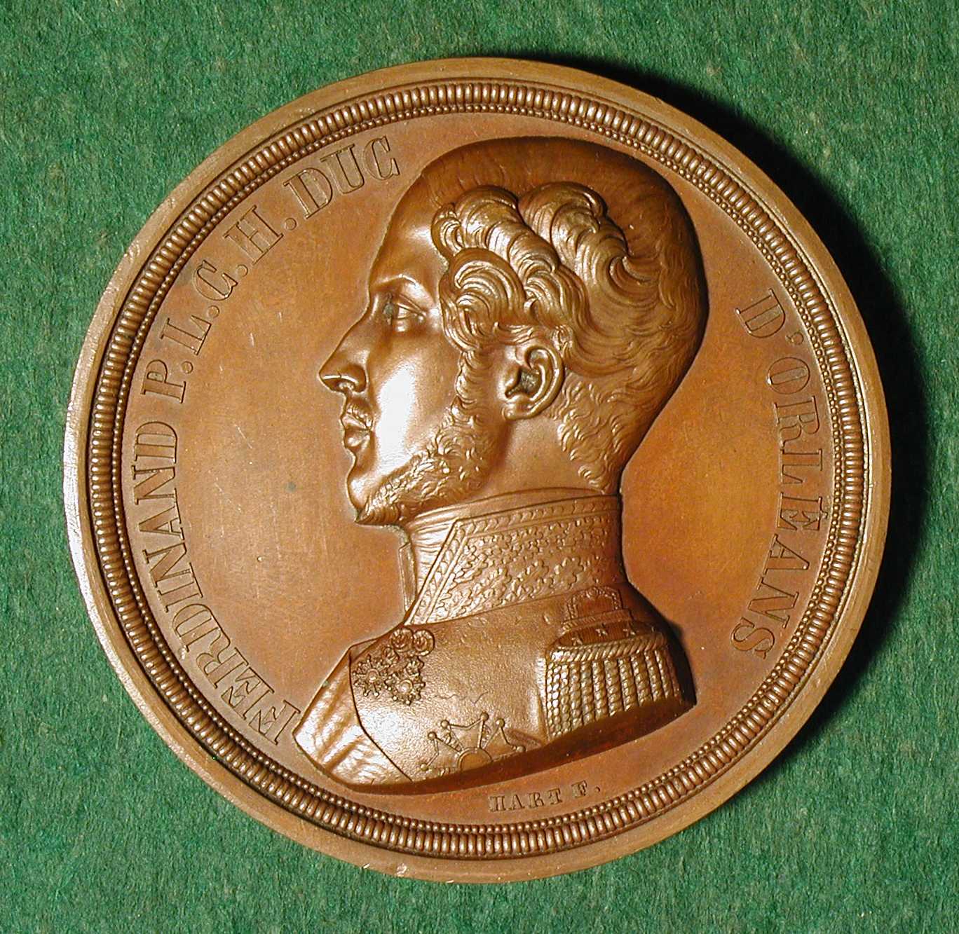 FERDINAND PHILIPPE, DEATH OF THE DUKE OF ORLEANS HART, Laurent Joseph: Belgium, 1842, Bronze, 73 mm Ferdinand Philip Louis Charles Henry, Duke of Orleans (1810-1842) was the son of Louis Philippe, the future King of France, and Marie Amelie, princess of the Two Sicilies. He was active as a soldier in the revolution in Belgium (1831-1832) and, as lieutenant general, served in the campaigns in Algeria (1835-1840). He died in 1842 after an accident at Neuilly, near Paris. This medal was issued to commemorate his death.