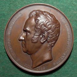 Ref: Van Hoydonck #117; Forrer VI, 488, 493; Eidlitz 115/680 Charles Henry Marcellis (1798-1864) was born in Antwerp, Belgium. He studied law and letters, then became active as writer, lawyer and publicist. Later he studied architecture and engineering and devoted his legal and literary talents to the industrial conditions of Belgium. In 1846 the iron bridge over the river Escaut at Ghent was constructed from his plans, a notable engineering feat at that time as it marked the substitution of iron for wood or stone. Marcellis also invented a mechanical device for emptying the large dry dock at Antwerp, and designed the roof of the stock exchange in that city, the latter work commemorated by this medal. (From Eidlitz) |