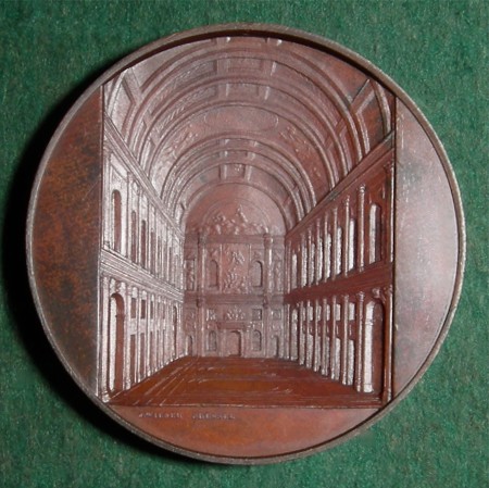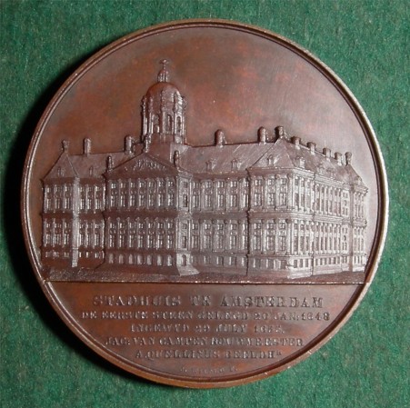 THE STADHUIS, AMSTERDAM WIENER, Jacques: Belgium, 1850, Bronze, 60 mm The Stadhuis or Town Hall of Amsterdam was originally a convent of St Cecilia. After the Reformation, the building was converted into the residence of the Stadholder; later it was occupied by the Admiralty. The Stadhuis became the Town Hall of Amsterdam when King Louis Napoleon took over the original Town Hall as his palace. The Stadhuis is now the Royal Palace in Amsterdam. The building is laid out around an inner courtyard and is built in the Renaissance style. The main feature surviving from the original complex is a pilastered facade of 1661. The architect of this building was Jakob van Kampen (Jacob van Campen), who was born in Haarlem in 1595. After his education in painting and architecture, van Kampen established himself in Amsterdam where he built the Stadhuis at the Dam. The laying of the foundation for this building took place in 1648, the year of the Peace of Munster and Westphalen, marking the end of the eighty years war. The building was opened in 1655 but was not completed until 10 years later. The Stadhuis is considered to be van Kampen’s masterpiece. It was at that time the largest building of its kind and was regarded by many as one of the most important buildings in the world. It demonstrated the supremacy of Amsterdam in Holland, the most influential province of the Netherlands. Besides being the architect of the Stadhuis, van Kampen built many private mansions. He also designed the monuments which were erected in honor of Admirals Tromp and van Galen. In addition to his architectural achievements, van Kampen is also regarded as a painter of some rank of the Dutch Baroque Era. Van Kampen died in Randenbroek in 1657. This medal is considered to be more rare that those in Wiener’s cathedral series. LINK to painting of The Stadhuis, Amsterdam by Isaak van Nickele (from artuk.org) LINK to Royal Palace (Stadhuis) (from Wikipedia) LINK to Biography of Jacob van Campen (from Web Gallery of Art)