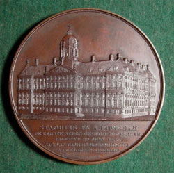 WIENER, Jacques: Belgium, 1850, Bronze, 60 mm Rev: Interior view Signed: J. WIENER F. / J. WIENER BRUSSEL Ref: Van Hoydonck # 64; Reinecke 64; Forrer VI, p. 487; Eidlitz 102/616 The Stadhuis or Town Hall of Amsterdam was originally a convent of St Cecilia. After the Reformation, the building was converted into the residence of the Stadholder; later it was occupied by the Admiralty. The Stadhuis became the Town Hall of Amsterdam when King Louis Napoleon took over the original Town Hall as his palace. The Stadhuis is now the Royal Palace in Amsterdam. The building is laid out around an inner courtyard and is built in the Renaissance style. The main feature surviving from the original complex is a pilastered facade of 1661. The architect of this building was Jakob van Kampen (Jacob van Campen), who was born in Haarlem in 1595. After his education in painting and architecture, van Kampen established himself in Amsterdam where he built the Stadhuis at the Dam. The laying of the foundation for this building took place in 1648, the year of the Peace of Munster and Westphalen, marking the end of the eighty years war. The building was opened in 1655 but was not completed until 10 years later. The Stadhuis is considered to be van Kampen’s masterpiece. It was at that time the largest building of its kind and was regarded by many as one of the most important buildings in the world. It demonstrated the supremacy of Amsterdam in Holland, the most influential province of the Netherlands. Besides being the architect of the Stadhuis, van Kampen built many private mansions. He also designed the monuments which were erected in honor of Admirals Tromp and van Galen. In addition to his architectural achievements, van Kampen is also regarded as a painter of some rank of the Dutch Baroque Era. Van Kampen died in Randenbroek in 1657. This medal is considered to be more rare that those in Wiener’s cathedral series. LINK to Royal Palace of Amsterdam (Stadhuis) (from wikipedia) LINK to Biography of Jacob van Campen (from Web Gallery of Art) |