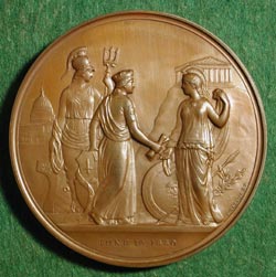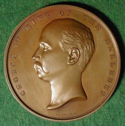 VISIT OF KING GEORGE I OF THE HELLENES TO THE CITY OF LONDON ADAMS, George Gammon: Greece, 1880, Bronze, 76 mm George I (1845-1913), king of the Hellenes (1863-1913), was the second son of Christian IX of Denmark and brother of Princess Alexandra of Denmark (the future Queen Consort of England). George succeeded Otto I (previously Prince Otto of Bavaria) as King , after Otto had been forced to flee Greece in 1862 after an insurrection. George, who was previously Prince Wilhelm of Denmark, was elected King of the Hellenes in 1863. In 1867, he married Princess Olga, daughter of Grand Duke Constantine of Russia. The King visited England in 1880, and was entertained by the Corporation of London at Guildhall, the event commemorated by this medal. George was assassinated at Salonika in 1913 by a mentally deranged Greek named Schinas who himself committed suicide while awaiting trial by jumping through a window during questioning. George had reigned almost fifty years and had planned to abdicate after his Golden Jubilee celebrations. |