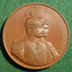 RECEPTION OF THE EMPEROR OF GERMANY ELKINGTON & Company: Germany, 1891, Bronze, 76 mm Friedrich Wilhelm Viktor Albert (1859-1941), Wilhelm II, Emperor of Germany, was King of Prussia from 1888 to 1918. He was the grandson of William I, King of Prussia and the first Emperor of Germany. He was also the grandson of Queen Victoria. His father was the Emperor and King Frederick III. His mother, the Dowager-Empress Frederick, was Princess Royal of Great Britain and Ireland. The Empress was Princess Augusta Victoria (1858-1921) of Schleswig-Holstein-Sonderburg-Augustenburg. |