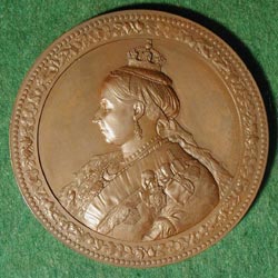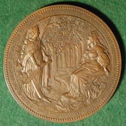 DEDICATION OF EPPING FOREST BY QUEEN VICTORIA WIENER, Charles: England, 1882, Bronze, 76 mm During the reign of Charles I, the Sovereign had rights to about 60,000 acres of forest. Since then, however large areas were in danger of encroachment. Accordingly, in 1871 the Epping Forest Act was passed which empowered Commissioners to survey the forest boundaries. Over the next several years other acts related to Epping Forest were passed until in 1878 the rights of the Crown were abolished and the Corporation of London was appointed Conservators of the Forest. The Corporation was able to obtain 5500 acres of Epping Forest, together with several other forests, by levying a tax on foreign corn. In 1882 Queen Victoria dedicated the forest to the free use and enjoyment of the public, the event commemorated by this medal. (From BHM). |