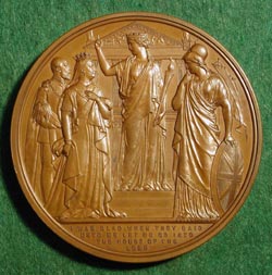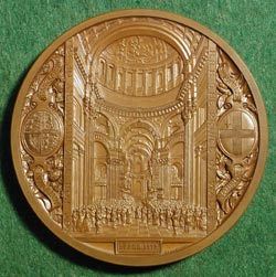 NATIONAL THANKSGIVING FOR THE RECOVERY OF THE PRINCE OF WALES FROM TYPHOID WYON, Joseph Shepherd & Alfred Benjamin: England, 1872, Bronze, 76 mm Albert Edward (1841-1910), Prince of Wales, was the eldest son of Queen Victoria and her Prince Consort, Albert. He studied at Oxford and Cambridge and visited the United States and Canada in 1860. In 1863 he married Princess Alexandra of Denmark. The Prince of Wales contracted typhoid fever in December 1871 and nearly died as a result. A national thanksgiving for his recovery was held at St. Paul's Cathedral on February 27, 1872, the event commemorated by this medal. LINK to portrait of the Prince of Wales by Franz Xaver Winterhalter (from Olga's Gallery) |