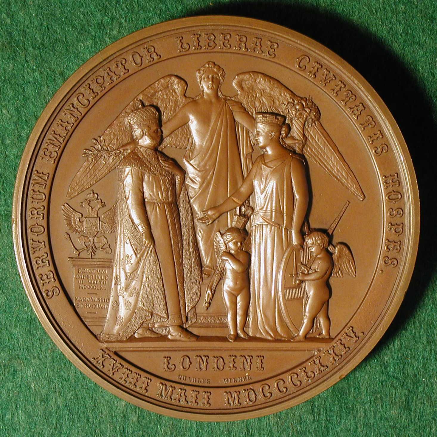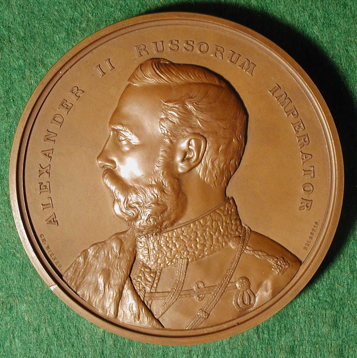 VISIT OF CZAR ALEXANDER II TO LONDON WIENER, Charles: Russia, 1874, Bronze, 76 mm Alexander II, 1818-81, czar of Russia (1855-81), son and successor of Nicholas I ascended the throne during the Crimean War (1853-56). Influenced by Russia's defeat in the war and by peasant unrest, Alexander embarked upon a modernization and reform program. The most important reform was the emancipation of the serfs (1861). This failed, however, to meet the land needs of the newly freed group and created many new problems. In 1881, after several unsuccessful attempts, a member of the People's Will, a terrorist offshoot of the populist movement, assassinated Alexander with a hand-thrown bomb. He was succeeded by his son Alexander III. LINK to