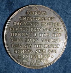 Rev: Legend: IOHANNS CHVRFVRST ZV SACHSSEN THVT, BEKENNEN FREY AVS HELDEN