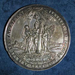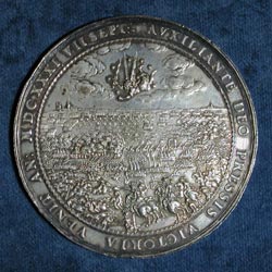 VICTORY ON THE BATTLE OF BREITENFELD DADLER, Sebastian: Sweden, 1631, Silver, 65 mm This medal was struck for the Saxon Elector John George I to commemorate the victory of the allied Swedish and Saxon troops over the imperial army, led by the great Bavarian general, Count Johann Tilly (1559-1632), at Breitenfeld, near Leipzig on September 17th 1631. In the Battle of Breitenfeld, the Saxons were forced to retreat, and Count Tilly moved his imperial infantry forces to a position in order to attack the exposed Swedish flank. However, a brilliant counter maneuver was executed by the Swedish King Gustavus II Adolphus, cutting Tilly off from his communications at Leipzig and separating him from his artillery. The result was the complete defeat of the imperial army. Tilly died shortly thereafter, in 1632, while trying to prevent the Swedish army from crossing over into Bavaria. |