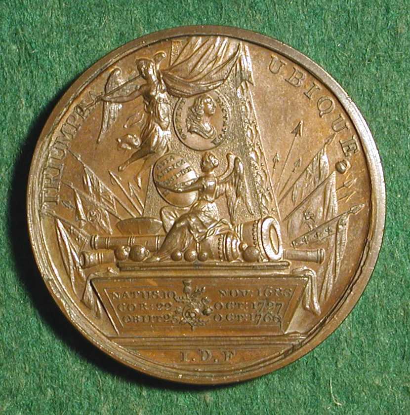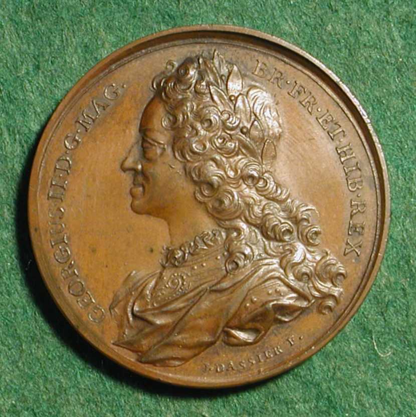 DEATH OF GEORGE II, TRIBUTE AND MEMORIAL DASSIER, Jean or Antoine: England, 1760, Bronze, 42 mm According to Eisler, this medal, despite it bearing the signature of Jean Dassier, was most likely re-engraved and struck by Antoine Dassier from dies then in his possession. The obverse is cut from dies made in 1731 for the Dedicatory medal for the Series of Kings and Queens of England. As the reverse die for this piece was cut after the King's death in 1760, this medal is often not included as part of Dassier's Series of the Kings and Queen of England. The reverse intimates that the King's arms had triumphed in every quarter of the globe, and under the direction of Pitt, whose authority was almost equivalent to that of a Roman Dictator, had been called to guide the helm at a time of extraordinary difficulties. |