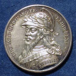 EDWARD III DASSIER, Jean: England, 1731, Silver, 41 mm Edward III (Edward of Windsor) 1312-1377) was king of England from 1327 to 1377. He was the eldest son of Edward II and Isabella of France. In 1328 Edward married Philippa. During the first three years of his reign, his mother, Isabella and Roger Mortimer wielded all the political power. In 1330 Edward mounted a successful coup and sought to remake England into the powerful nation it had been under Edward I. During the 1330s England gradually drifted into a state of hostility with France, thus starting the 100 years’ war. He led several campaigns in France, was present in person at the great naval battle off the Flemish city of Sluis in 1340, in which he all but destroyed the French navy and won a victory at Crecy in 1346, claiming the title of King of France. In 1356 Edward’s son, Edward the Black Prince, captured John II (The Good) of France at the Battle of Poitiers. During Edwards III’s reign, the Black Death brought heavy mortality to his country. Domestically, Parliament was divided into two Houses and was permanently located at Westminster. He spent much time and money in rebuilding Windsor Castle. He also instituted the Order of the Garter, which became Britain’s highest order of knighthood. In his old age, Edward’s sons, Edward the Black Prince, and John of Gaunt, took over the government. He was succeeded by his grandson, Richard II.