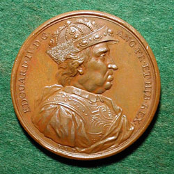 Edward IV (1442-1483), King of England (1461–1470, 1471-1483), was the son of Richard, Duke of York, and Cicely, daughter of Ralph Neville, Earl of Westmoreland. Edward was a leading participant of the Yorkist-Lancastrian conflict know as the War of the Roses. He was crowned King of England in1461 after the defeat of the Lancastrians. However, when the Earl of Warwick changed sides, Edward was forced into exile, but returned to defeat Warwick at the Battle of Barnet in 1471, regaining the crown until his death in 1483. Edward died leaving two sons, "the princes of the Tower," but the throne was usurped by his brother, Richard III. The coronation was on the 29th, not the 20th of June as stated in the exergue of the medal. |