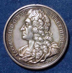 JAMES II DASSIER, Jean: England, 1731, Silver, 41 mm James II (1633 - 1701), Duke of York (1634-1685), and King of England, Scotland and Ireland (1685-1688), was the third son to Charles I and Henrietta Maria. During the Civil War he fled to France but returned to England and became king after the death of his older brother Charles II, who had been restored to the throne after Cromwell's Commonwealth collapsed. Unlike his brother, James maintained a strong adherence to the Roman Catholic faith. He married a Roman Catholic princess, Mary of Modena, and tried to convert England to Catholicism. His zealous piety and his determination to impress Catholicism on his subjects was to prove his nemesis. Within days of James' accession, Protestants began rallying around Charles' son, James, Duke of Monmouth, whom they believed should be king. The rebellion was easily quashed and Monmouth was beheaded. Continuing his religious campaign, James had Catholics promoted to high-status positions while he appointed the 'Bloody Assizes' to execute, torture or enslave Protestant rebels. The Declaration of Indulgence (1687) granted tolerance of Catholics and non-conformists. In response, both Tories and Whigs turned against the king. On the birth of his son, James was deposed in the Glorious Revolution of 1688, the Protestant Parliament having allied themselves with James' Protestant daughter Mary (Mary was the daughter of James’ first wife Anne Hyde, a Protestant who raised her daughter in the same faith), and her husband William of Orange, who eventually took the throne of England as William and Mary. That revolution, engendered by James’ Roman Catholicism, permanently established Parliament as the ruling power of England. James died an exile in Saint-Germain, the last Stuart monarch in the direct male line (Queen Anne being the last Stuart monarch). (From www.bbc.co.uk) |
