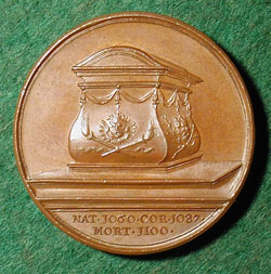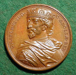 William II (1060-1100) (William Rufus) was the son of William the Conqueror and King of England from 1087 to 1100. Rufus, ‘the Red’ because of his ruddy complexion, was William’s third (second surviving) and favorite son. In accordance with feudal custom, William I bequeathed his inheritance, the Duchy of Normandy, to his eldest son, Robert II, and his kingdom by conquest, England , was given to Rufus. William II prevented the dissolution of political ties between England and Normandy, but his strong-armed rule earned him a reputation as a brutal and corrupt tyrant. (Thompson) The reverse of this medal is an allegory of Avarice associated with this ruler, represented by the winged head, indicating that when a man accustoms himself to that vice it always carries him too far. The flames would then represent the consuming frenzy of Avarice, and the withered branches the end result of indulging in this sin. (Eisler) |