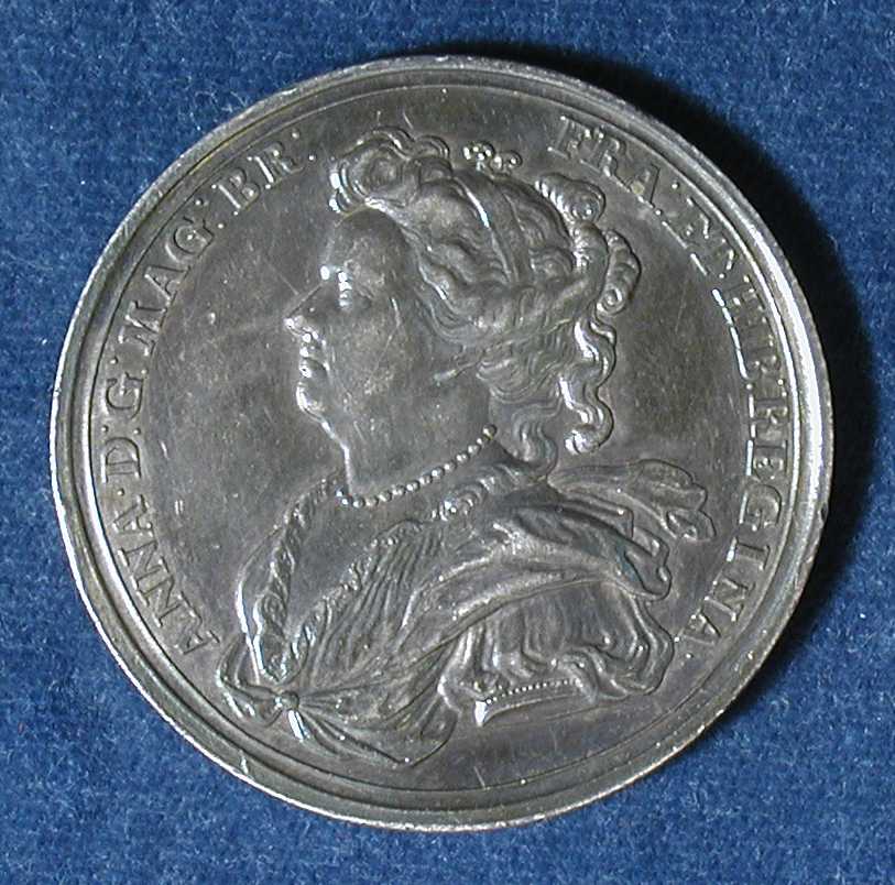 ANNE AND PRINCE GEORGE OF DENMARK* CROKER, John: England, 1702, Silver, 42 mm Anne (1665-1714) was the daughter of the Duke of York (later James II) and Anne Hyde. She was crowned in Westminster Abbey in 1702. She married Prince George of Denmark (1653-1708), second son of King Frederick III of Denmark, in 1683. Anne supported the Church of England and presided over Cabinet meetings, but remained above the new political parties (Whigs and Tories). One of the more notable events that occurred during her reign was the creation of a single parliament for England and Scotland by the Act of Union in 1707. Anne was religious and was noted for homely virtues, but lacked broader interests. The outstanding achievements in the War of the Spanish Succession were due to the efforts of her Captain-General, John Churchill, 1st Duke of Marlborough. This medal commemorates the investiture of Queen Anne's husband, George, Prince of Denmark, with the title of Generalissimo of all her forces by sea and land. Soon afterwards, he was made Lord High Admiral of England and Ireland. LINK to the War of Spanish Succession (from Wikipedia) LINK to Act of Union 1707 (from Wikipedia) *SOLD