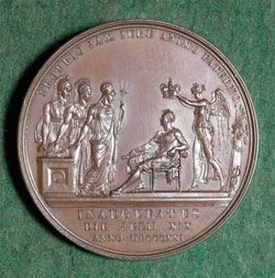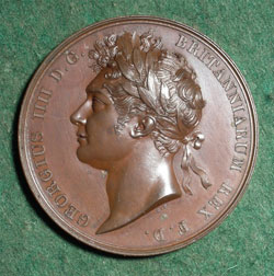 George Augustus Frederick (1762-1830), king of Great Britain and Ireland (1820-1830), was the eldest son of George III. As a child he was naturally gifted and was well taught in the classics, leaning to speak French, Italian and German fluently. He had considerable taste for music and the arts, which he encouraged when he became king, having built the Royal Pavilion, Brighton, and being largely instrumental in the foundation of the National Gallery, London and King's College. George had a poor relationship with his father, openly opposing him and supporting the Whig leader Charles Fox. He also created a scandal when he contracted a secret, illegal marriage to a Roman Catholic widow, later marring his cousin, Caroline of Brunswick, then trying to divorce her. He even forbade Caroline to attend his coronation. Before his father’s death in 1820, George Augustus served for nine years as the Prince Regent when George III suffered from a relapse into insanity from an illness that is now suspected to have been porphyria. (Porphyria is a group of genetic disorders caused by abnormalities in the chemical steps leading to the production of heme. Heme, a substance found in the blood and bone marrow, is chemically a porphyrin and is the non-protein component of the oxygen carrying protein hemoglobin.) George IV’s reign was noted for stubbornness, self-indulgence and extravagance. Though he ignored most of his constitutional duties, fortunately for Great Britain he left the conduct of the Napoleonic Wars in the capable hands of the Duke of Wellington and Viscount Castlereagh. George IV died in 1830 and was succeeded by his niece Victoria. This is the official coronation medal of George IV. |