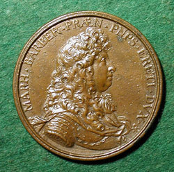 CHERON, Jean Francois: France, ca.1685, Bronze (cast), 46 mm Obv: Bust of Barberini (r) MAPH. BARBER. PRAEN. PNPS. ERETI. DVX. & Rev: Three bees lead a plow in the field. TRIA. POTIORA. Signed: CHERON Ref: Johnson vol. I n. 123 Maffeo Barberini (1631-1685), the nephew of Pope Urban VIII, was crown prince of Palestrina. In 1653 he married Olimpia Giustiniani, grandniece of Innocent X. The Barberini's were a wealthy and important family in Rome. They included Pope Urban VIII and several princes. In Rome one can still find the via Barberini, Piazza Barberini and Palazzo Barberini. |