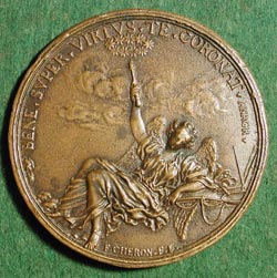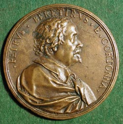 (cast), 72 mm Pietro Berrettini (called Pietro da Cortona) (1596-1669), a Florentine by origin, was an eminent Italian painter and architect. He was the founder of the Roman High Baroque style in painting and ranks as one of the great figures of the Roman Baroque. As he trained many pupils, his style was carried forth into the eighteenth century. Pietro specialized in highly illusionistic ceiling paintings in which paint is combined with stucco and gilt to create arresting effects. The greatest of these frescos are in Rome in the Palazzo Barberini and Chiesa Nuova, and in Florence in the Palazzo Pitti. His fresco ceiling in the Palazzo Barberini, Triumph of Divine Providence, is in the Italian Baroque style. Although he was less interested in architecture and regarded it as a pastime, his church of SS. Martina e Luca in Rome is of high quality; indeed, his architectural achievements are considered to be second only to Gian Lorenzo Bernini among seventeenth-century Roman architects. Besides excelling in painting and architecture, Pietro da Cortona, along with Peter Paul Rubens, designed the 13 tapestries now hanging in the Philadelphia Museum of Art, depicting the events in the life of Constantine the Great. The reverse legend of this medal is an anagram of the obverse titles. The piece appears to be an old after-cast. LINK to fresco by Pietro da Cortona Triumph of Divine Providence (from Web Gallery of Art) |