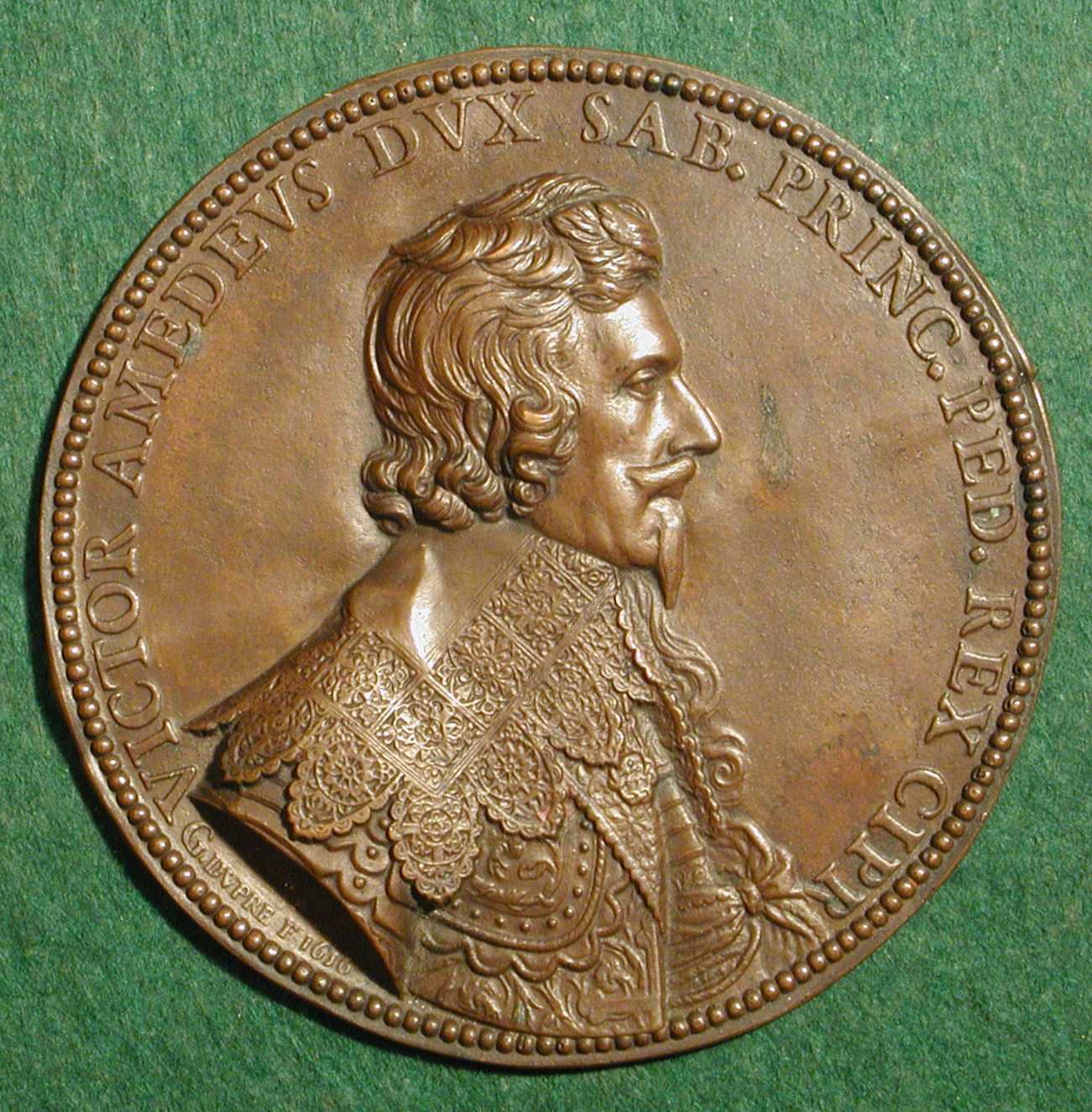 VICTOR AMADEUS I, DUKE OF SAVOY DUPRÉ, Guillaume: France, 1636, Bronze, 105 mm Victor Amadeus (1587-1637) was the son of Charles Emmanuel I. He became Victor Amadeus I, Duke of Savoy, on the death of his father in 1630. He also held the titles of Prince of Piedmont and King of Cyprus. He succeeded to little more than a title, but by his alliance with France – his wife Christina Bourbon (whom he married in 1619), being the daughter of Henry IV of France and Marie de' Medici – he managed to regain most of his territories. He proved to be a wise and popular ruler but died at an early age in 1637. His son was Charles Emmanuel II, Duke of Savoy. The House of Savoy was a dynasty which ruled over the territory of Savoy and Piedmont for nine centuries, and since 1860 over the kingdom of Italy. LINK to Biography and Portrait of Victor Amadeus (from Wikipedia)