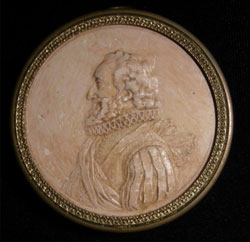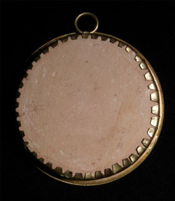Uniface plaster medallion enclosed in brass ring with suspension loop