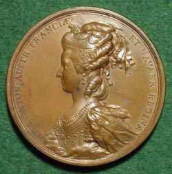 LOUIS XVI AND MARIE ANTOINETTE DUVIVIER, Benjamin: France, 1781, Bronze, 72 mm For a brief biographical sketch of Louis XVI see the medal ‘CORONATION OF LOUIS XVI AT RHEIMS’. Marie Antoinette (1755-1793) was the daughter of Emperor Francis I and Maria Theresa of Austria. She married Louis XVI in 1770, becoming the Queen consort. Marie Antoinette was never popular with the French public. (She was once to have exclaimed 'If I was not Queen, one would say that I had an insolent air'). She was often accused of putting Austrian interests ahead of those of her husband's kingdom. Her unpopularity was increased by her extravagant spending, which was often unfairly connected with the grave financial difficulties that beset France in the 1780s. This uncertain position put her in danger in the revolutionary period. This was not helped by her uncompromising stance to even the more moderate revolutionaries and her attempts at collusion with other European powers to try to suppress the insurgents. After the royal family failed to escape in 1791, and monarchy was abolished in 1792, Louis XVI was tried for treason and executed in January 1793. The former queen was tried by the National Assembly and executed a few months later that year.