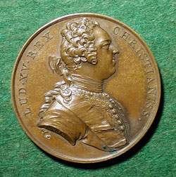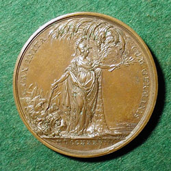 The Peace of Austria (Peace of Vienna) relates to the War of Polish Succession which had begun in 1733 when Augustus II of Poland died. While Austria and Russia declared themselves in favor to the succession of his son Augustus II, a number of Polish nobles, who were in relations with France, chose Augustus II’s former opponent, Stanislaus Leszczynski, whose daughter was married to the young French king, Louis XV. Out of the quarrel arose the War of the Polish Succession, which was chiefly fought in Italy and the upper Rhineland and which ended unfavorably for Austria. In the Peace of Vienna (1738), the emperor was forced to abandon Sicily and Naples which were placed under the rule of one of the Spanish princes, Don Carlos. Of special significance to Germany was the consent of the emperor to the cession of Lorraine. This duchy which had long been in the possession of France was given over to Stanislaus Leszczyski, as compensation for his abandonment of all claim to the Polish crown. Although the War of Polish Succession ended in 1735, a final peace treaty was not signed until 1738, the event commemorated by this medal. (From Encyclopedia Britannica). |