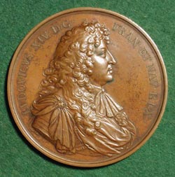 CAPTURE OF TOURNAI AND COURTRAI ? : France, 1667, Bronze, 89 mm Starting in 1667 and lasting until the turn of the century, Louis fought a series of wars to accomplish his goals of expanding the French empire. The first was the so-called War of Devolution (1667-1668). The Spanish king, Philip IV, had recently died, and Louis saw his chance to expand into the Spanish Netherlands. Using an old custom of Brabant and Hainaut in which the children of a first marriage supersede those of the second, he claimed the Spanish Netherlands had devolved to him in the name of his wife, Maria Therese, daughter of the deceased King by his first marriage. The French army, led by Marshal de Turenne, overran Flanders prompting the United Provinces, England and Sweden to form the Triple Alliance. Louis succeeded in retaining a number of captured cities, including Tournai and Courtrai, the subject of this medal. The capture of Tournai by Louis XIV in 1667 caused it to have as bishops a series of Frenchmen. After the Treaty of Utrecht (1713) the French bishops were replaced by Germans. PAINTING OF THE ARMY OF LOUIS XIV AT TOURNAI in 1667 by Adam Frans van der MEULEN (from Web Gallery of Art) |