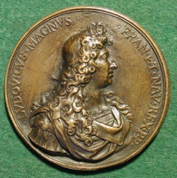 80 mm Louis XIV (1638-1715), called Louis the Great and the Sun King, was the son of Louis XIII and Anne of Austria. He became king at the age of five upon the death of his father in 1643. Louis XIV enjoyed the longest reign in European history and had the most splendid court on the continent, both in culture and in regal ostentation, exemplified by his luxurious royal palace at Versailles. During his minority, power lay in the hands of the queen-mother Anne of Austria, and her minister Cardinal Mazarin. The Thirty Years War was coming to an end: the Fronde was at end by 1653 along with the Peace of Westphalia (1648) and the Peace of the Pyrenees (1659), the latter cemented by the marriage of Louis to his cousin, the Infanta Maria Thersa. With this marriage and victories the king entered Paris in triumph in 1660. With the death of Mazarin in 1661, Louis became his own first minister. Although in some respects art and literature had passed its zenith, France during his reign was unquestionably the first state in Europe both in arms and arts, and within France the authority of the king was practically undisputed. In 1667 there began a long series of wars, which with little real intermission lasted to the end of the reign. The War of Devolution in 1667-1668 to enforce the queen's claim to certain districts in the Spanish Netherlands, led to the Dutch War (1672-78), where France clearly triumphed. The next decade was a turning point in the history of the reign, as the strength of France was seriously diminished. The chief causes of this were the revocation of the Edict of Nantes, which lost most of his Protestant support, and later by the war with the Grand Alliance.LINK to painting of Louis XIV by Hyacinthe Rigaud (from Web Gallery of Art) |